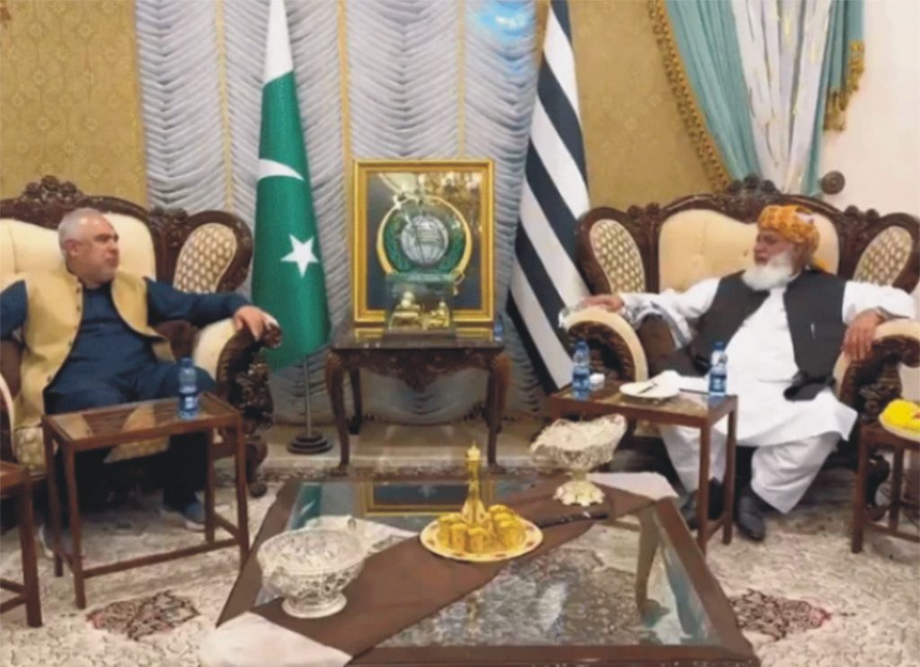 پی ٹی آئی وفد نے امیر جے یو آئی مولانا فضل الرحمان کی رہائش گاہ اسلام آباد کا دورہ کیا جہاں رہنماؤں نے موجودہ ملکی سیاسی اور خطے کی صورتحال پر گفتگو کی۔پی ٹی آئی وفد میں سابق اسپیکر اسد قیصر، صوبائی صدر جنید اکبر، شہرام ترکئی شامل تھے، جے یوآئی کے مولانا صلاح الدین ایوبی، جلال الدین ایڈوکیٹ، مولانا اسجد محمود ملاقات میں شریک تھے، مولانا فضل الرحمان کی جانب سے پی ٹی آئی وفد کے اعزاز میں عشائیہ دیا گیا۔ملاقات میں خیبر پختونخوا میں امن وامان کے حوالے سے پی ٹی آئی کی جانب سے قومی جرگہ کے انعقاد کی تجویز پر مولانا فضل الرحمان سے مشاورت کی گئی، مولانا فضل الرحمان نے قومی جرگہ کی تجویز کا خیر مقدم کیا۔پی ٹی آئی وفد نے پارلیمنٹ میں اپوزیشن کو متحد کرنے کیلئے کردار ادا کرنے کی اپیل کی،