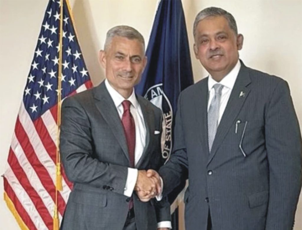 پاکستانی سفیر نے امریکی محکمہ خارجہ کے اعلیٰ عہدیدار سے ملاقات کی ہے، جس میں دونوں ممالک کے مابین تعلقات کے فروغ پر بات چیت کی گئی۔ امریکی محکمۂ خارجہ کے بیورو آف ساؤتھ اینڈ سینٹرل ایشین افیئرز کے اسسٹنٹ سیکرٹری ایس پال کپور سے پاکستانی سفیر رضوان سعید شیخ نے ملاقات کی۔سماجی رابطے کی ویب سائٹ ایکس (سابق ٹوئٹر) پر اپنے پیغام میں ایس پال کپور نے کہا کہ انہیں پاکستانی سفیر سے اسٹیٹ ڈیپارٹمنٹ میں ملاقات کر کے خوشی ہوئی۔ انہوں نے کہا کہ فریقین نے پاک امریکا تعلقات کو آگے بڑھانے اور دونوں ممالک کو زیادہ خوشحال و محفوظ بنانے کے حوالے سے حکمت عملی پر تبادلہ خیال کیا۔پاکستانی سفیر رضوان سعید شیخ نے بھی ملاقات کے بعد اپنے پیغام میں کہا کہ انہوں نے اسسٹنٹ سیکریٹری پال کپور کو نئی ذمہ داریاں سنبھالنے پر مبارکباد دی۔ انہوں نے بتایا کہ ملاقات میں قیادت کی سطح پر پاک امریکا تعلقات کو اقتصادی طور پر مضبوط اسٹریٹجک شراکت داری میں تبدیل کرنے پر بات چیت ہوئی۔رضوان سعید شیخ نے کہا کہ اس مقصد کے لیے باہمی دلچسپی کے متعدد شعبوں میں مسلسل رابطہ ضروری ہے۔