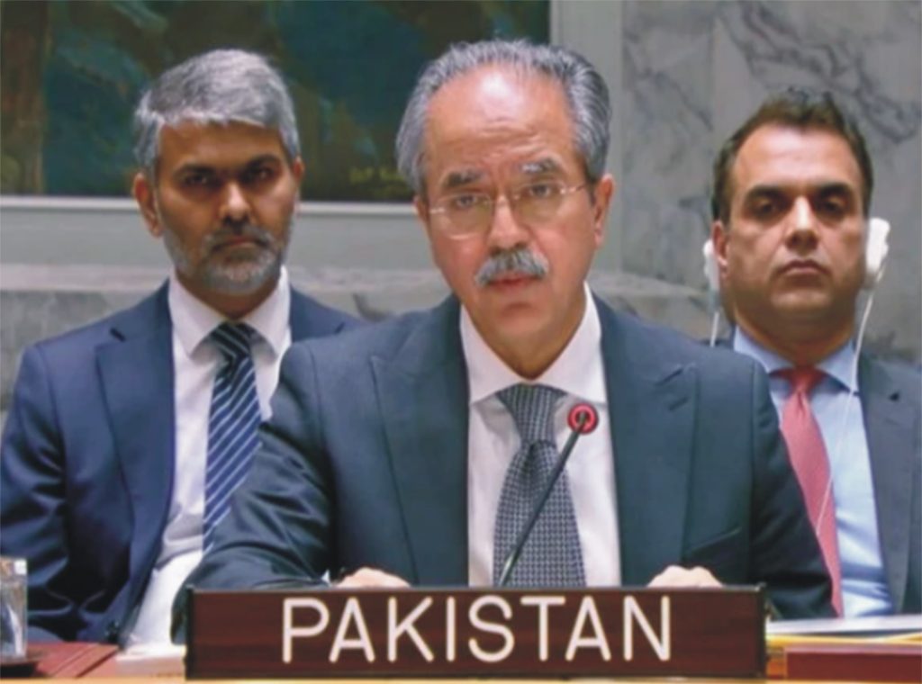 اقوام متحدہ میں پاکستان نے مسئلہ فلسطین کو مشرق وسطیٰ میں جاری بے یقینی اور عدم استحکام کی بنیادی وجہ قرار دیتے ہوئے واضح کر دیا ہے کہ غزہ میں جاری جنگ، جبری نقل مکانی اور تباہی ناقابل قبول ہے۔سلامتی کونسل کے اجلاس سے خطاب کرتے ہوئے پاکستان کے مستقل مندوب عاصم افتخار نے کہا کہ غزہ میں جنگ بندی کی خلاف ورزیاں تشویشناک ہیں اور نہتے شہریوں کو نشانہ بنانا عالمی قوانین کی صریح خلاف ورزی ہے۔انہوں نے اقوام متحدہ کی تنصیبات اور یو این آر ڈبلیو اے پر حملوں کی سخت الفاظ میں مذمت کی۔پاکستانی مندوب نے زور دیا کہ سلامتی کونسل کی قرارداد 2803 کے تحت طے شدہ امن منصوبے پر مکمل عملدرآمد ناگزیر ہے۔انہوں نے مطالبہ کیا کہ فوری اور مستقل جنگ بندی کی جائے، انسانی امداد کی بلا رکاوٹ فراہمی یقینی بنائی جائے اور غزہ کی ہنگامی بنیادوں پر تعمیر نو کا آغاز کیا جائے۔عاصم افتخار نے واضح کیا کہ پاکستان ایک خودمختار فلسطینی ریاست کے قیام کو ناگزیر سمجھتا ہے، جو 1967 سے قبل کی سرحدوں پر قائم ہو اور جس کا دارالحکومت القدس الشریف ہو۔انہوں نے کہا کہ فلسطینی عوام کے ساتھ پاکستان کی یکجہتی کسی بھی صورت متزلزل نہیں ہو سکتی۔پاکستانی مندوب نے اسرائیل سے مطالبہ کیا کہ وہ شام اور لبنان میں بھی اپنی غیر قانونی کارروائیاں فوری طور پر بند کرے، کیونکہ ایسے اقدامات پورے خطے کو مزید عدم استحکام کی طرف دھکیل رہے ہیں۔